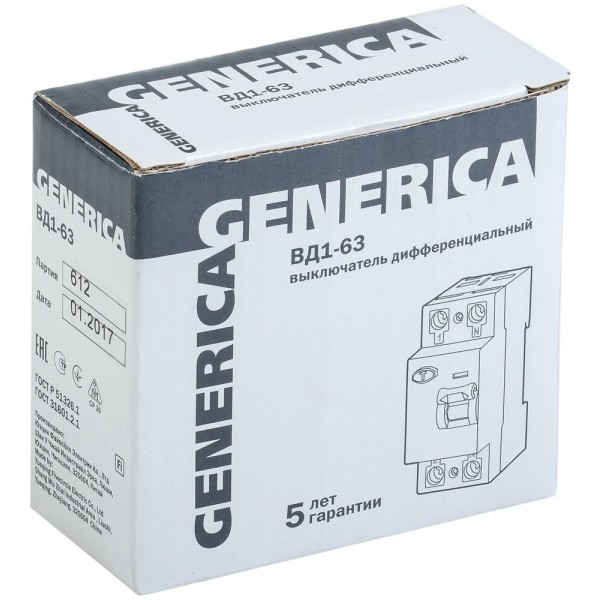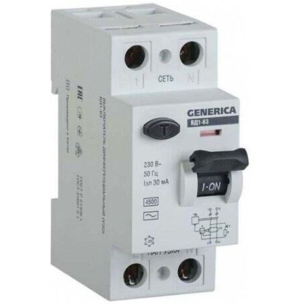 IEK Выключатель дифф.тока УЗО MDV15-2-063-030 ВД1-63 Generica 63A 4.5kA 30мА AC 2П 230В 2мод серый (упак.:1шт)