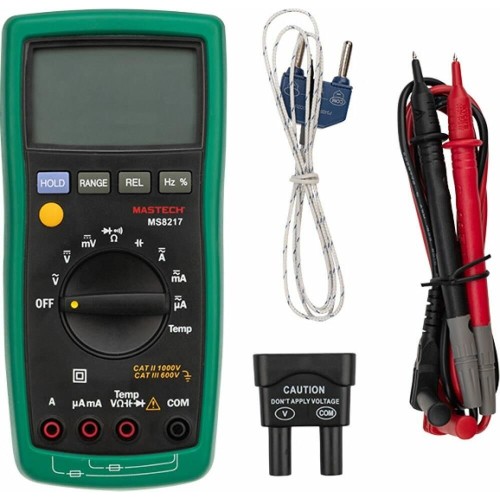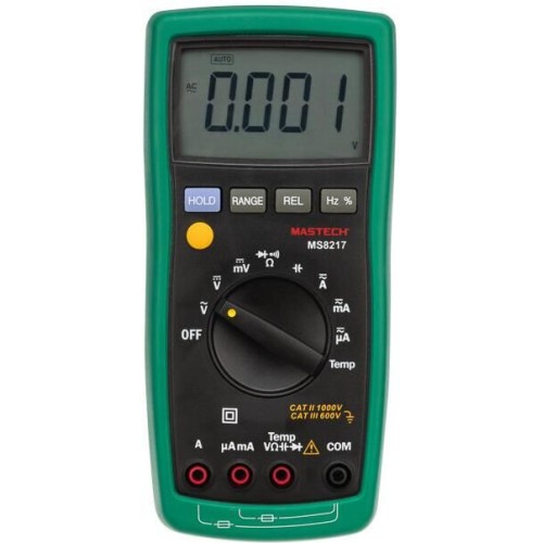 Мульти́метр — электроизмерительный прибор, который включает в себя несколько функций и набор измеряемых параметров. Все приборы серии MS8217 измеряют постоянное и переменное напряжение, а также постоянный и переменный ток, сопротивление в цепи, емкость, частоту и даже температуру. С помощью данного прибора можно проводить тестирование диодов и осуществлять прозвонку целостности цепи. Таким образом, один прибор сможем заменить сразу несколько устройств одновременно. Также у этих MS8217 есть режим относительных измерений (REL), который позволяет проводить более точные измерения благодаря вычету влияния электрических параметров самого прибора, ведь как сам прибор, так и его щупы имеют свое сопротивление, индуктивность и емкость. Прибор MS8217 обладает широким функционалом и это выгодно отличает его от других. Прибор имеет функцию удержания результата измерений DATA HOLD для тех случаев, когда измерения проводятся в труднодоступных местах и не всегда есть возможность взглянуть на экран.