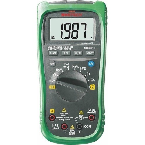 Профессиональный мультиметр MS8361D MASTECH T-RMS с возможностью беспроводного подключения к мобильным устройствам – это идеальное решение для профессиональных техников и инженеров. Пользователь получает возможность находиться на дистанции от измеряемого контура для снижения опасности во время осмотра или измерения. Приложение MASTECH позволяет просматривать запись и чтение данных на мобильном телефоне. Мультиметр великолепно оснащен, кроме измерений напряжений до 600 В и токов до 10 А, он также измеряет емкость, частоту и скважность и многое другое, имеет бесконтактный детектор напряжения NCВ, ручной и автоматический выбор диапазонов измерений.