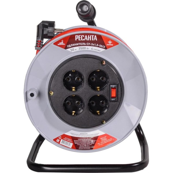 РЕСАНТА Удлинитель силовой СУ-3х1,5-50/2, розеток 4шт, 3x1.5 кв.мм, 50м, ПВС, катушка, красный [61/118/12]