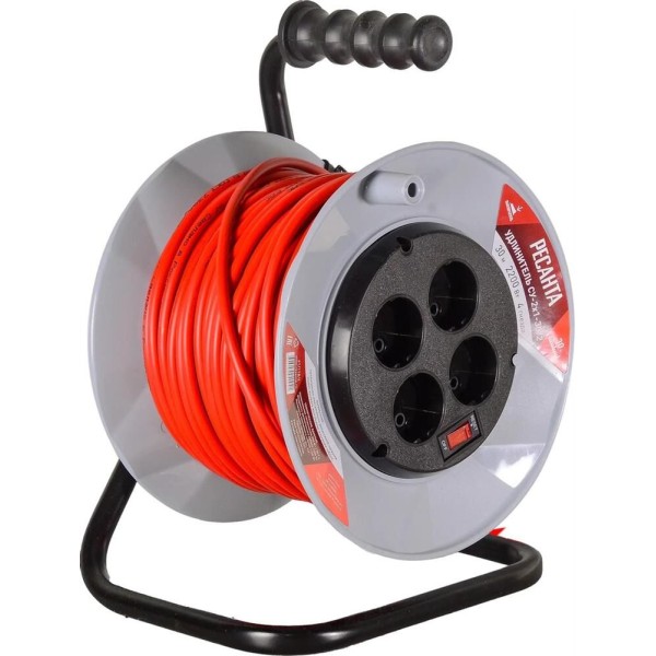 РЕСАНТА Удлинитель силовой СУ-2х1-30/2, розеток 4шт, 2x1.0 кв.мм, 30м, ПВС, катушка, красный [61/118/4]