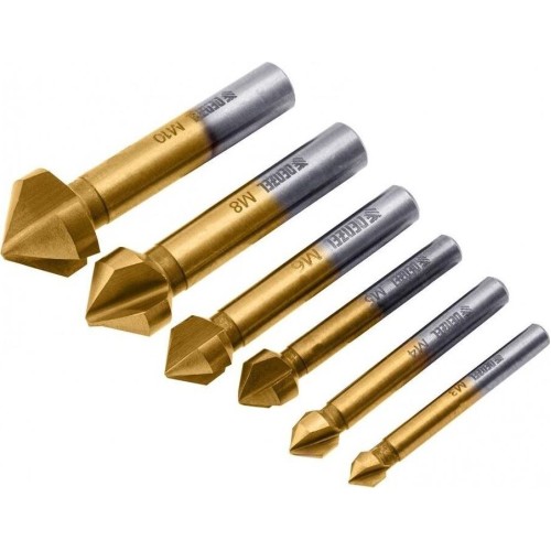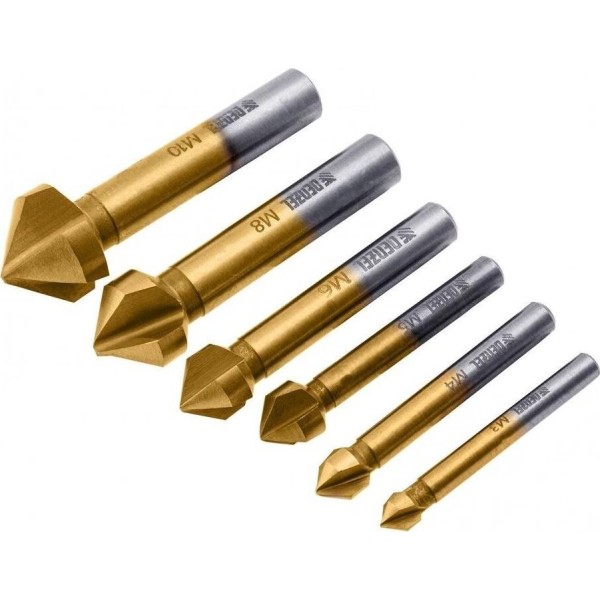 Набор зенковок M3-M10 Denzel 72313, 6 шт. из стали HSS, в комплекте с металлическом кейсом, применяется при работе с электрическими дрелями и сверлильными станками. Зенковки используются для выполнения конических отверстий и снятия фасок в стали, цветных металлах, пластике и древесине.ПреимуществаКомплект содержит 6 зенковок наиболее популярных размеров M3-M10.Три режущие кромки и идеальные углы заточки обеспечивают точную и быструю обработку отверстий.Монолитная конструкция из быстрорежущей стали гарантирует эффективную работу оснастки.Нитридтитановое покрытие обеспечивает долгий срок службы за счет сниженного коэффициента трения.Прочный металлический кейс позволяет с удобством транспортировать и размещать набор в зоне хранения.