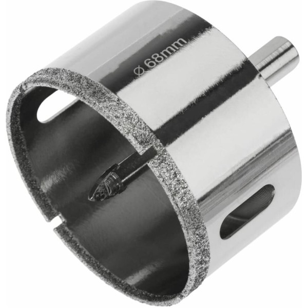 Алмазная коронка диаметром 68 мм используется при сверлении керамогранита, керамики, стекла. Наличие центровочного сверла обеспечивает точное позиционирование коронки на поверхности и помогает избежать смещения во время работ. Покрытие алмазной коронки выполнено гальваническим способом в два слоя, что обеспечивает эффективное сверление и продолжительный рабочий ресурс инструмента. Равномерное распределение алмазов по режущей кромке гарантирует аккуратное сверление материала без трещин и сколов. Высота алмазного слоя в 6 мм обеспечивает высокую производительность, а трехгранный хвостовик – надежную фиксации в патроне. При использовании алмазных коронок для сверления отверстий необходимо охлаждение, которое достигается путем подачи воды в рабочую зону.