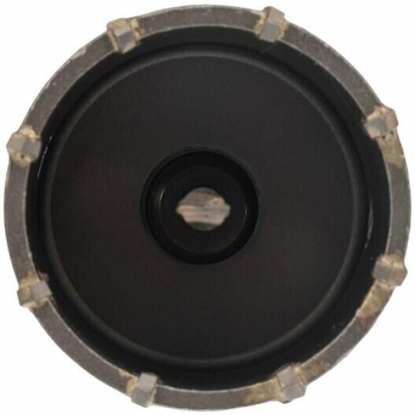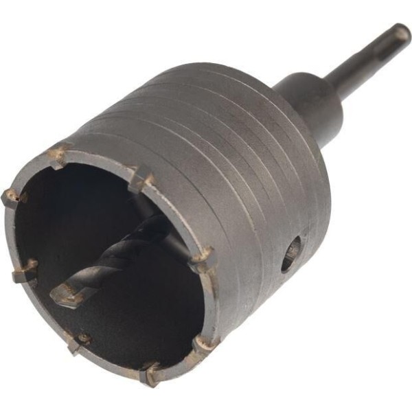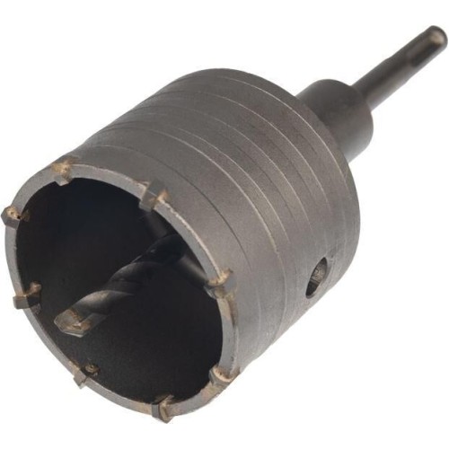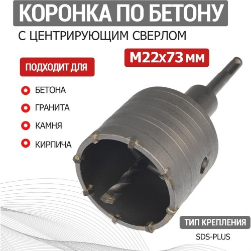 Коронка по бетону предназначена для сверления отверстий под трубы, розетки и выключатели в поверхностях из бетона, гранита, кирпича и камня при помощи перфораторов с патроном SDS PLUS. Корпус коронки изготовлен из углеродистой стали, а зубья и наконечник центрирующего сверла из твердого сплава ВК8, что гарантирует надежность и прочность оснастки. Спиральная канавка на внешней стороне коронки обеспечивает эффективный отвод шлама, снижая нагрузку на перфоратор. На коронку нанесено защитное консервирующее покрытие на масляной основе, обеспечивающее коррозионную стойкость. Коронка поставляется с центровочным сверлом и хвостовиком. Посадочный диаметр сверла (М22).