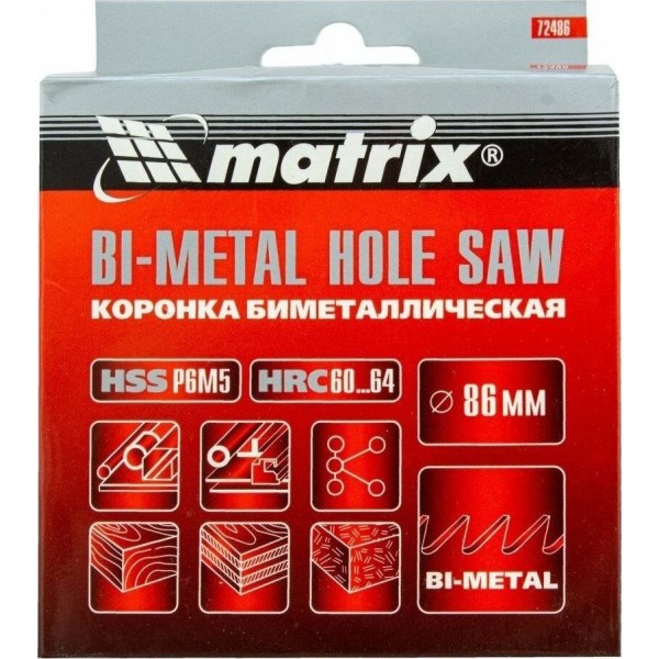 Коронка Matrix BIMETAL 72486 диаметром 86 мм — режущий инструмент, который устанавливается на дрель, перфоратор или стационарный станок. Используется для быстрого сверления черных и цветных металлов, пластика и других материалов. Позволяет получить отверстия большого диаметра при проведении электромонтажных работ и прокладке коммуникаций.ПреимуществаНадежная конструкция — корпус выполнен из углеродистой стали, зубья приварены методом электросварки.Эффективность — рабочая часть из быстрорежущей стали обеспечивает высокую скорость сверления.Совместимость с разными типами патронов — на коронку можно установить хвостовик с шестигранным или SDS PLUS профилем Matrix 72490, 72492, 72494, 72496 (приобретается отдельно).