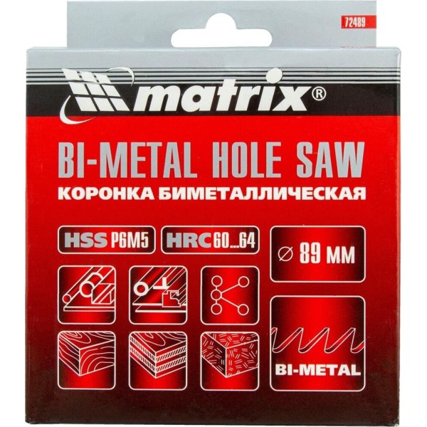 Коронка Matrix BIMETAL 72489 диаметром 89 мм — режущий инструмент, который устанавливается на дрель, перфоратор или стационарный станок. Используется для быстрого сверления черных и цветных металлов, пластика и других материалов. Позволяет получить отверстия большого диаметра при проведении электромонтажных работ и прокладке коммуникаций.ПреимуществаНадежная конструкция — корпус выполнен из углеродистой стали, зубья приварены методом электросварки.Эффективность — рабочая часть из быстрорежущей стали обеспечивает высокую скорость сверления.Совместимость с разными типами патронов — на коронку можно установить хвостовик с шестигранным или SDS PLUS профилем Matrix 72490, 72492, 72494, 72496 (приобретается отдельно).