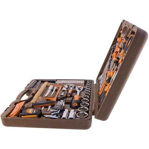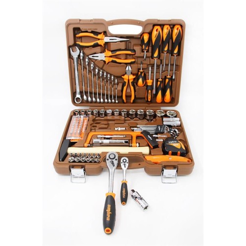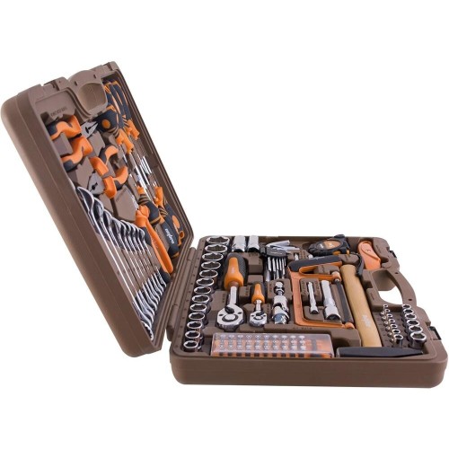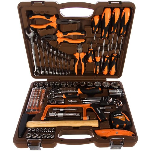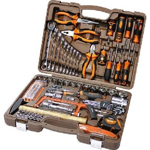 рулетка: 5 м; возможно несколько вариантов дизайнов ручек, шарнир карданный 1/4", ножовка 150 мм, 100 мм; удлинитель 1/2": 125 мм, удлинитель 1/4": 50, шарнир карданный 1/2", переходник для вставок-бит 1/4"DR*1/4"HDR, рукоятка трещоточная 1/2", рукоятка отверточная 1/4", 72 зубца, в комплекте: рукоятка трещоточная 1/4"