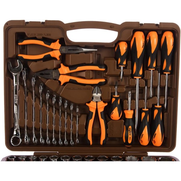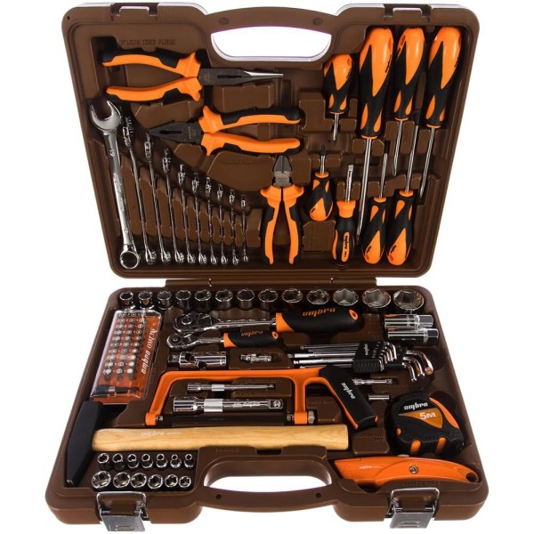 ключи торцевые, трещотка, тонкогубцы, рукоять для головок, рукоять для бит, плоскогубцы, пассатижи, отвёртки, ножовка по металлу, молоток, круглогубцы, ключи имбусовые (шестигранные), ключи гаечные, ключ разводной, длинногубцы, вороток для головок, бокорезы