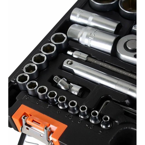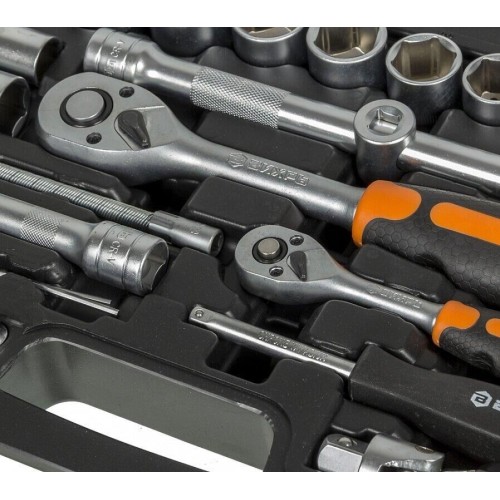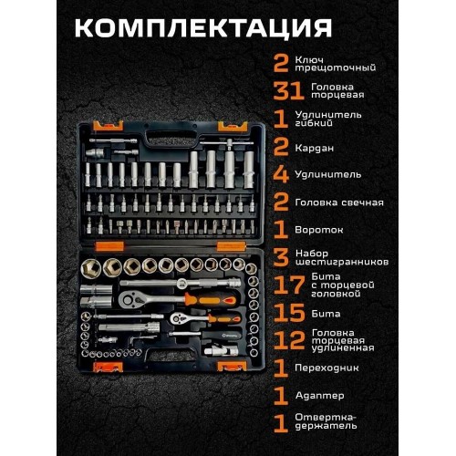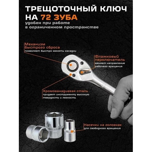 трещотка: 1/2", 1/4"; удлинитель гибкий 1/4" под ключ: 145 мм; кардан 1/2"; кардан 1/4"; вороток 1/2" и 1/4"; переходник 1/2" четырёхгранника на шестигранник H 5/1
