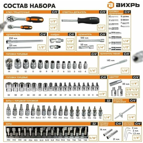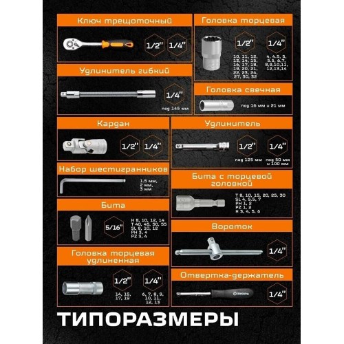 T30; SL4, 27, 30, 32 мм; 1/4": 4, 4.5, 5, 5.5, 6, 7, 8, 9, 10, 14 мм; удлинённые 1/2": 14, 19 мм; 1/4": 6, 13 мм; свечные: 16, 21 мм; со вставками: Т8, T10, T15, T20, 23, T25, 22, SL5.5, 21, SL7; PH1, PH2; PZ1, PZ2; H3, H4, H5, H6; удлинитель 1/2" 125 мм.; удлинитель 1/4": 50 мм, 100 мм;, 20, 19, 18, 17, 16, 15, 14, 13, 12, 11, 1/2": 10, 24