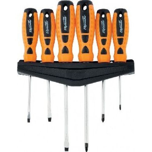 Новая серия отверток Point предназначена для монтажа и демонтажа резьбовых соединений разных типов и размеров. Жало отвертки намагничено и имеет фосфатированное покрытие. Стержень отвертки изготовлен из качественной хромованадиевой стали, имеет никелированное покрытие, устойчивое к воздействию коррозии. Твердость рабочей части 50-52 HRC. Двухкомпонентная рукоятка разработана с использованием последних технологий, что позволяет увеличить передачу крутящего момента и снизить нагрузку на запястье. Эргономичная форма обеспечивает удобство при продолжительной работе. SL4 x 100 мм, SL5 x 100 мм, SL6 x 150 мм, Ph0 x 80 мм, Ph1 x 100 мм, Ph 2 x 150 мм.