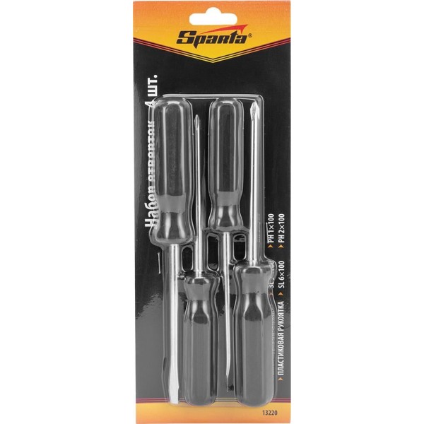 Наборы отверток SPARTA Набор отверток 4 шт, SL5 X 100,6 X 100, PH1 X 100, 2 X 100, углеродистая сталь, пластиковая рукоятка 13220