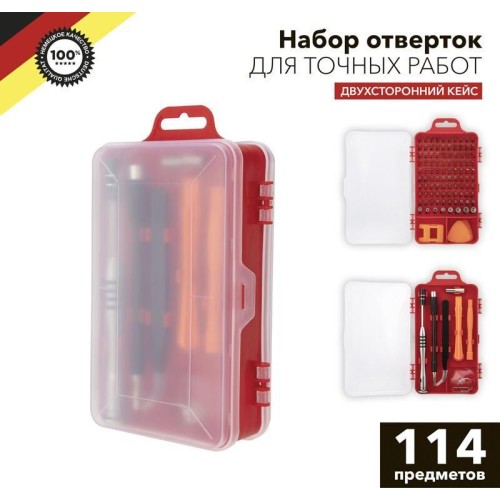 Набор отверток для точных работ KRANZ отлично подходит для ремонта телефонов, компьютеров, приемников и для многих популярных приборов, которые используются в быту. Выполнен из высококачественной хромованадиевой стали CR-V с высокой устойчивостью к коррозии и образованию ржавчины. Точно подобранные по характеристикам магнитные насадки отлично подходят для профессионального ремонта и для мелких бытовых работ. В наборе 114 предметов: Биты: PH000х2, PH00х2, PH0х2, PH1х2, PH2х2 Special PH2 SL1х2, SL1.3х2, SL1.5х2, SL2х2, SL3х2, SL3.5х2, SL4x2 T2х2, T3х2, T4х2, T5х2, T6x2, T7x2, T8x2, T9x2, T10x2, T15x2, T20x2 H0.7x2, H0.9x2, H1, H1.3, H1.5, H2, H2.5, H3, H3.5, H4 P2х2, P5х2, / Pentalobe 0.8х2, 1.2х2, Triangle 2x2, 2.3x2 SQ0,1x2 U2.3х2 ° 0.8x2 Y0.6х2, Y2х2, Y3x2 PZ000x2, PZ00x2, PZ0x2, PZ1x2, PZ2x2 M2.5, M3, M3.5, M4, M4.5, M5, M5.5 Рукоятка, удлинитель, гибкий удлинитель, пинцет, переходник, магнит, присоска, игла Спуджеры и медиаторы: 10 шт. Посадка бит: 1/8