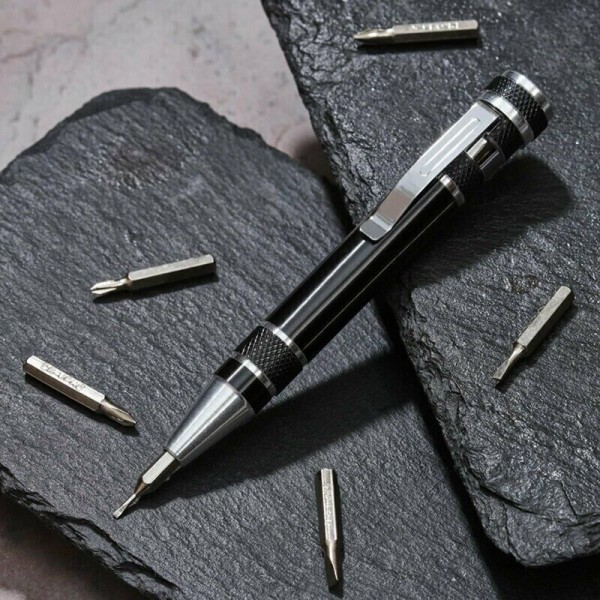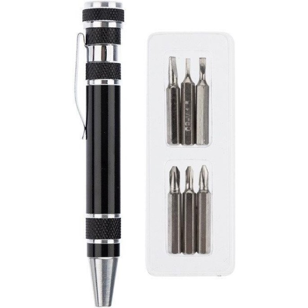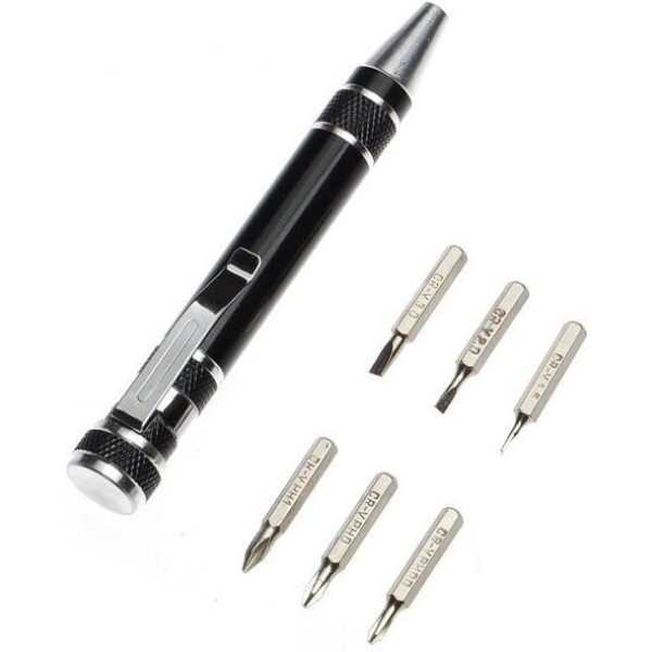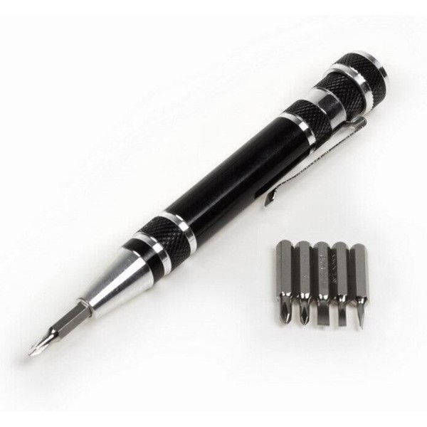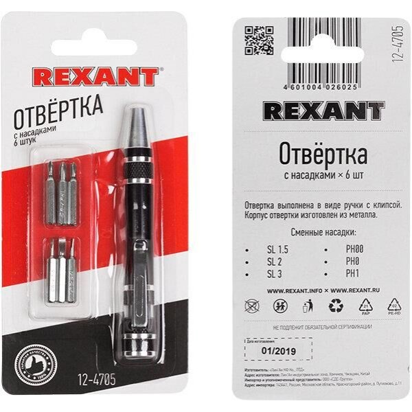 Отвертка с 6 насадками REXANT, предназначена для монтажа и демонтажа резьбовых соединений в бытовых условиях. Отвертка изготовлена из алюминия (не подвержена коррозии). Выполнена в виде ручки с с зажимом-клипсой для удобного закрепления, к примеру, на кармане рубашки. Зона хвата на рукоятке удобной формы не даст пальцам скользить даже во время быстрой работы. В набор входят отвертка и 6 сменных насадок: SL 1.5, SL 2, SL 3, PH00, PH0, PH1