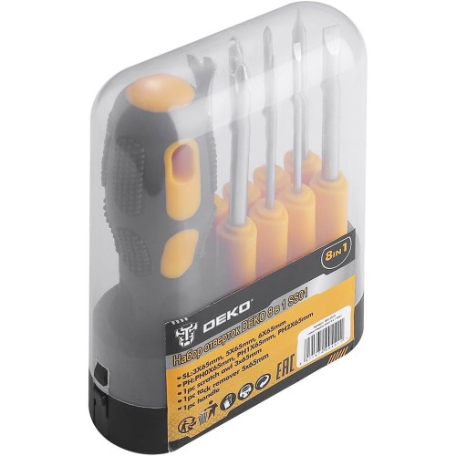 Набор отверток DEKO 8 в 1 SS01 включает в себя: 3 шт Slotted:3х65мм,5х65мм,6х65мм 3 шт Phillips:PH0х65мм,PH1х65мм,PH2х65мм 1 шт чертилка 3х65мм 1 шт гвоздодер для гвоздей и кнопок 5х65мм 1 шт рукоятка