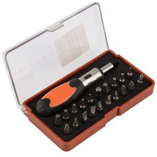 пластиковый кейс, в наборе: отвертка-трещотка, биты 25 мм — 20 шт. (ph1, ph2, ph3, pz1, pz2, sl3, sl4, sl5, sl6, sl7, h2, h3, h4, h5, h6, t10, t15, t20, t25, t30), цвет кейса: не указан., 2 цветных стикера, упаковка: плёнка, термопластичная резина, полипропилен, материалы: хром-ванадиевая сталь