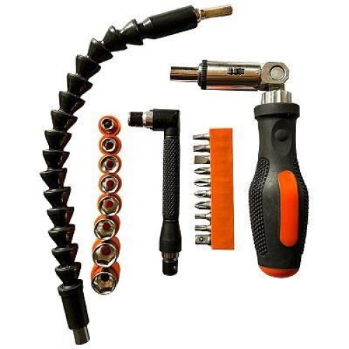 В наборе: - отвертка реверсивная с шарниром - биты 25 мм - 9 шт: PH1, PH2 PZ1, PZ2 SL4, SL5, SL6 T15, T20 - торцевые головки - 8 шт: 5мм, 6мм, 7мм, 8мм, 9мм, 10мм, 11мм, 12мм - адаптер 1/4 - адаптер угловой для бит - гибкий удлинитель для бит Материал: углеродистая сталь, пластмасса, ТПР Упаковка - блистер
