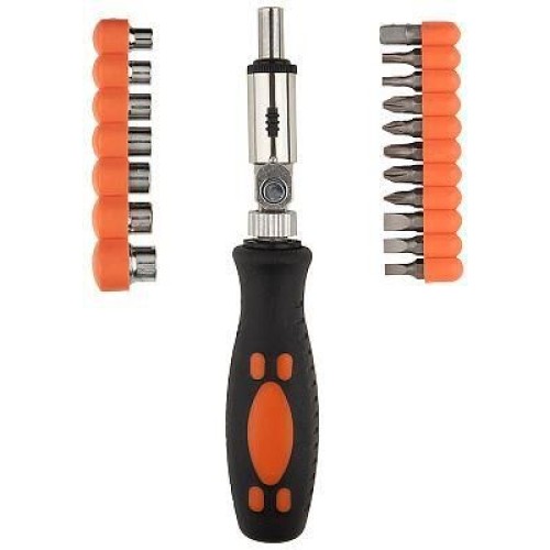 В наборе: - отвертка реверсивная с шарниром - торцевые головки - 7 шт: 5мм, 6мм, 7мм, 8мм, 9мм, 10мм, 11мм - биты 25 мм -10 шт: PH1, PH2, PH3 PZ1, PZ2 SL4, SL5, SL6 T15, T20 - адаптер 1/4 Материалы: углеродистая сталь, пластмасса Упаковка: блистер