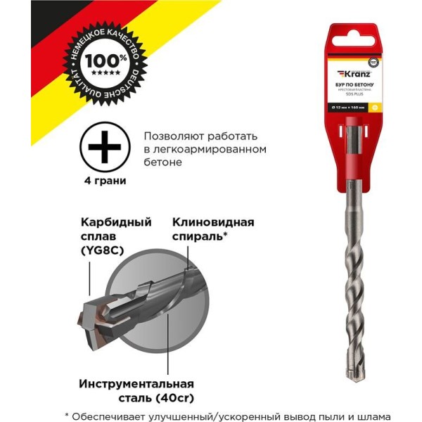 Бур по бетону с крестообразным наконечником 12x160 мм KRANZ используется во время строительных и ремонтных работ. Предназначен для сверления и бурения отверстий в слабоармированном бетоне, граните, кирпичной кладке и камне при помощи перфоратора с креплением SDS PLUS, которое используется в большинстве электроинструментов бытового и профессионального назначения. Изделие выполнено из качественной стали, что обеспечивает долгий ресурс работы и высокую производительность. Конструкция со стабилизирующей спиралью сохраняет точное положение бура во время сверления и равномерно распределяет ударную нагрузку, кромки с 4 гранями обеспечивают легкое выведение шлама и мелких частиц пыли из рабочей зоны, что поддерживает скорость работы, а усиленный резец предотвращает заклинивание оснастки в арматуре. Твердосплавная вставка на конце бура способствует эффективному входу в материал, что увеличивает цикл службы оснастки и уменьшает износ сверла.