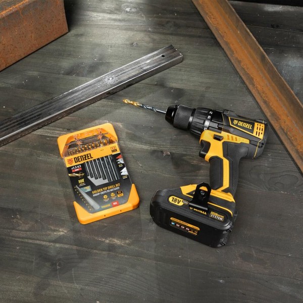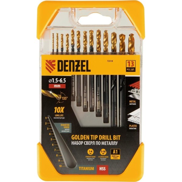 Набор сверл DENZEL Набор сверл по металлу, 1,5-6,5 мм, HSS-Tin, Golden Tip, 13 шт 72318