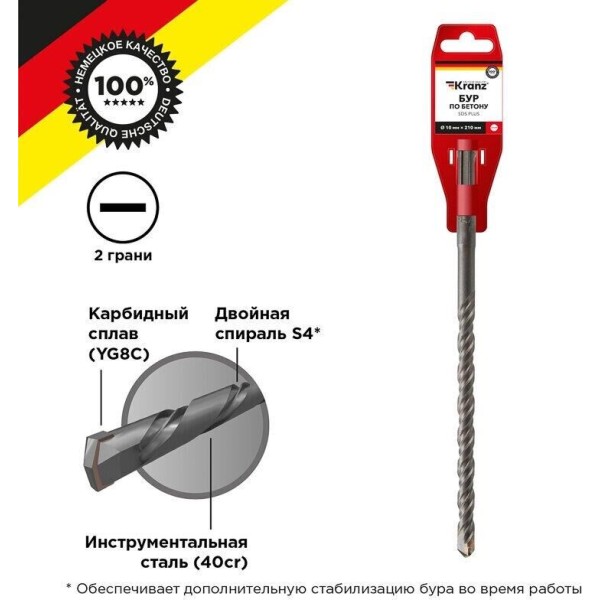 Бур с хвостовиком SDS PLUS KRANZ используется во время строительных и ремонтных работ. Предназначен для сверления и бурения отверстий в граните, бетоне, кирпичной кладке и камне при помощи перфоратора с креплением SDS PLUS, которое применяется в большинстве электроинструментов бытового и профессионального назначения. Изделие выполнено из инструментальной стали, обеспечивающей долгий ресурс работы и высокую производительность. Конструкция со стабилизирующей спиралью сохраняет точное положение бура во время сверления и равномерно распределяет ударную нагрузку. На режущей пластине имеется центрирующая головка – во время работы бур не уводит в сторону, что повышает качество сверления и продлевает ресурс работы инструмента. Твердосплавная вставка на конце бура, изготовленная из карбидного сплава (YG8C), обеспечивает эффективный вход в материал, продлевая цикл службы оснастки и уменьшая износ.