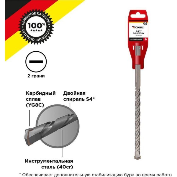 Бур с хвостовиком SDS PLUS KRANZ используется во время строительных и ремонтных работ. Предназначен для сверления и бурения отверстий в граните, бетоне, кирпичной кладке и камне при помощи перфоратора с креплением SDS PLUS, которое применяется в большинстве электроинструментов бытового и профессионального назначения. Изделие выполнено из инструментальной стали, обеспечивающей долгий ресурс работы и высокую производительность. Конструкция со стабилизирующей спиралью сохраняет точное положение бура во время сверления и равномерно распределяет ударную нагрузку. На режущей пластине имеется центрирующая головка – во время работы бур не уводит в сторону, что повышает качество сверления и продлевает ресурс работы инструмента. Твердосплавная вставка на конце бура, изготовленная из карбидного сплава (YG8C), обеспечивает эффективный вход в материал, продлевая цикл службы оснастки и уменьшая износ.