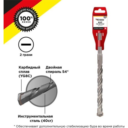 Бур с хвостовиком SDS PLUS KRANZ используется во время строительных и ремонтных работ. Предназначен для сверления и бурения отверстий в граните, бетоне, кирпичной кладке и камне при помощи перфоратора с креплением SDS PLUS, которое применяется в большинстве электроинструментов бытового и профессионального назначения. Изделие выполнено из инструментальной стали, обеспечивающей долгий ресурс работы и высокую производительность. Конструкция со стабилизирующей спиралью сохраняет точное положение бура во время сверления и равномерно распределяет ударную нагрузку. На режущей пластине имеется центрирующая головка – во время работы бур не уводит в сторону, что повышает качество сверления и продлевает ресурс работы инструмента. Твердосплавная вставка на конце бура, изготовленная из карбидного сплава (YG8C), обеспечивает эффективный вход в материал, продлевая цикл службы оснастки и уменьшая износ.