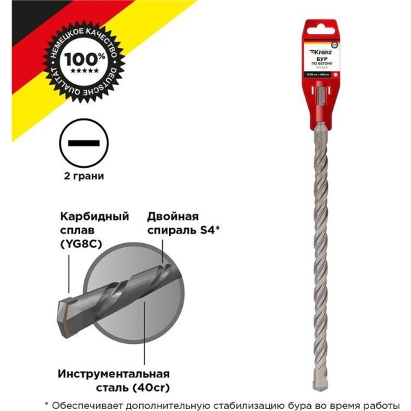 Бур с хвостовиком SDS PLUS KRANZ используется во время строительных и ремонтных работ. Предназначен для сверления и бурения отверстий в граните, бетоне, кирпичной кладке и камне при помощи перфоратора с креплением SDS PLUS, которое применяется в большинстве электроинструментов бытового и профессионального назначения. Изделие выполнено из инструментальной стали, обеспечивающей долгий ресурс работы и высокую производительность. Конструкция со стабилизирующей спиралью сохраняет точное положение бура во время сверления и равномерно распределяет ударную нагрузку. На режущей пластине имеется центрирующая головка – во время работы бур не уводит в сторону, что повышает качество сверления и продлевает ресурс работы инструмента. Твердосплавная вставка на конце бура, изготовленная из карбидного сплава (YG8C), обеспечивает эффективный вход в материал, продлевая цикл службы оснастки и уменьшая износ.