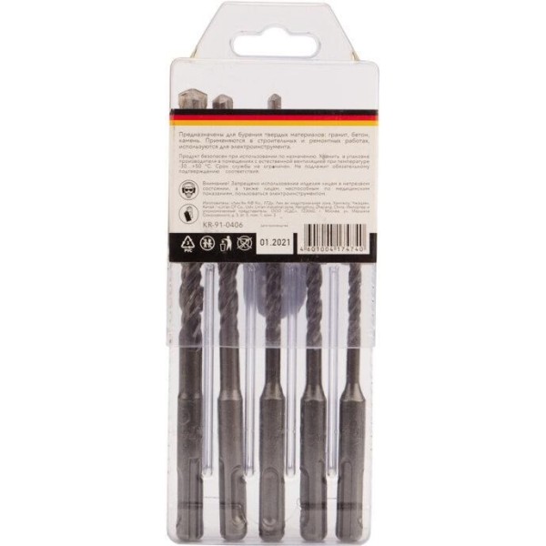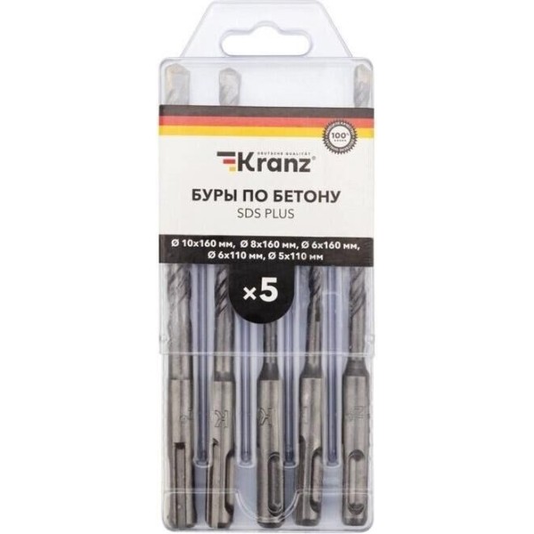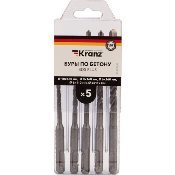 Бур KRANZ (KR-91-0406) Набор буров по бетону 5-6х110х50, 6-8-10х160х100мм, 5 шт, в пластиковой коробке SDS PLUS