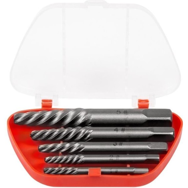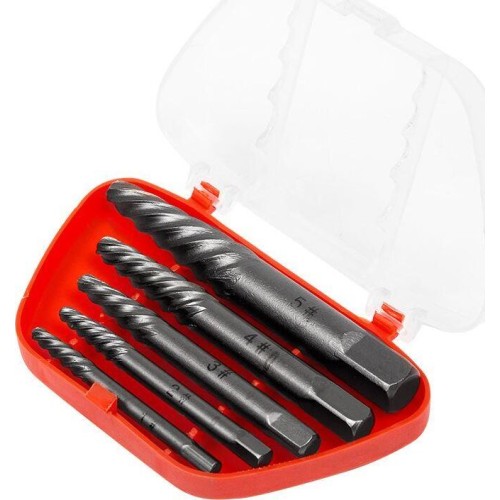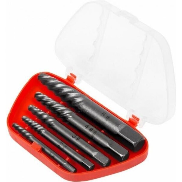 Набор экстракторов – это комплект специальных инструментов, созданных для удаления поврежденных или застрявших шурупов. Набор состоит из пяти экстракторов разных размеров, что позволяет использовать их для различных типов и размеров шурупов. Экстракторы изготовлены из легированной инструментальной стали, что обеспечивает их прочность и долговечность. Каждый экстрактор имеет специальную спиральную форму, которая позволяет легко вкрутить его в поврежденный шуруп. Типоразмеры экстракторов: № 1 (М3-М6); № 2 (М6-М8); № 3 (М8-М11); № 4 (М11-М14); № 5 (М14-М18).