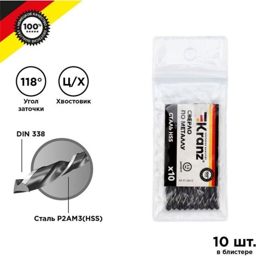 Сверло KRANZ (KR-91-0612) Сверло по металлу 3,5х70х39мм (HSS), DIN 338, 10 шт. в упаковке