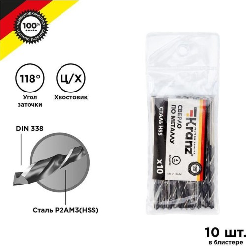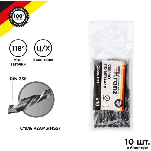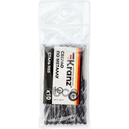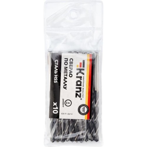 Сверло KRANZ (KR-91-0614) Сверло по металлу 4,0х75х43мм (HSS), DIN 338, 10 шт. в упаковке