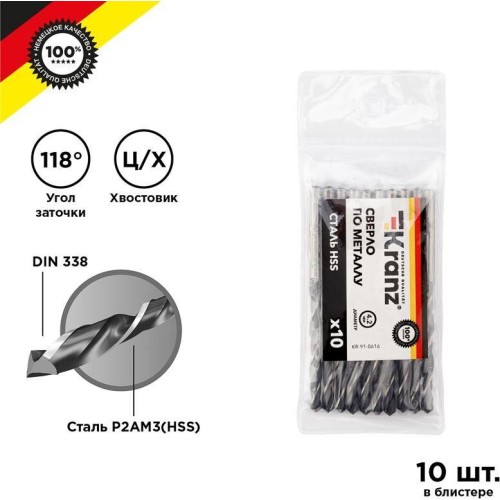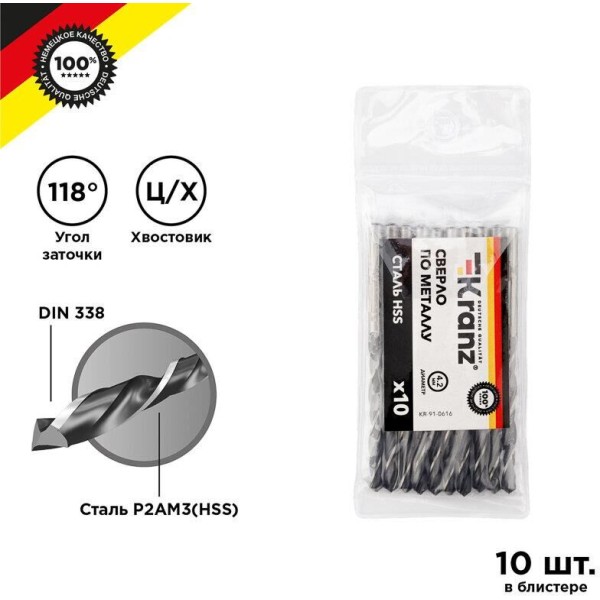 Сверло KRANZ (KR-91-0616) Сверло по металлу 4,2х75х43мм (HSS), DIN 338, 10 шт. в упаковке