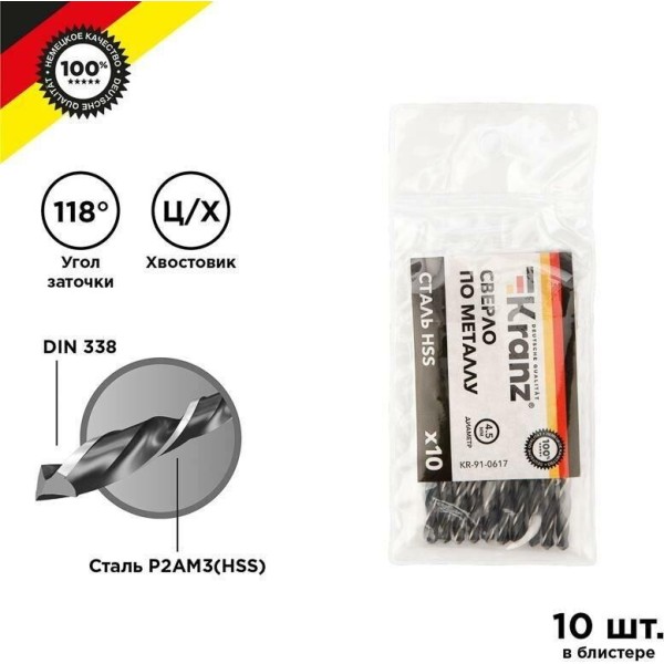 Сверло KRANZ (KR-91-0617) Сверло по металлу 4,5х80х47мм (HSS), DIN 338, 10 шт. в упаковке
