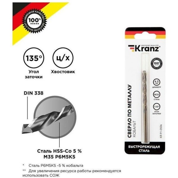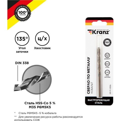 Сверло KRANZ (KR-91-0506) Сверло по металлу 4,5х80х47мм Кобальт (сталь HSS-Co 5% M35 P6M5K5) DIN 338, 1 шт. в блистере