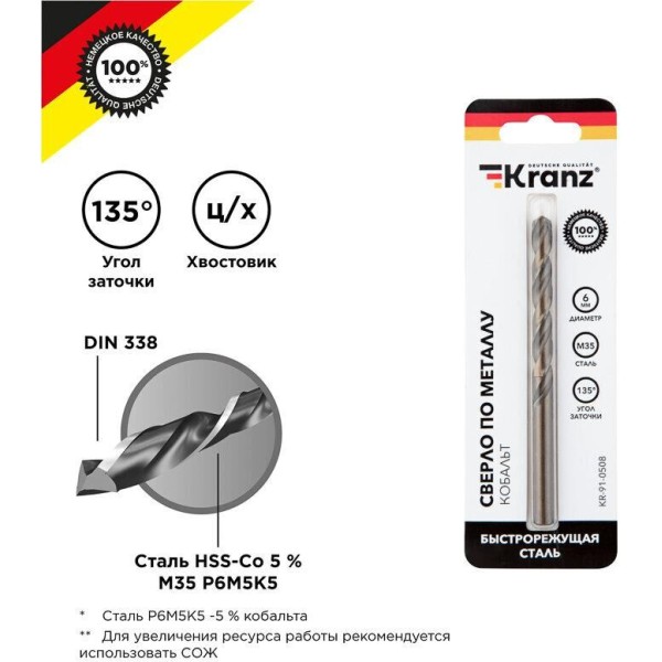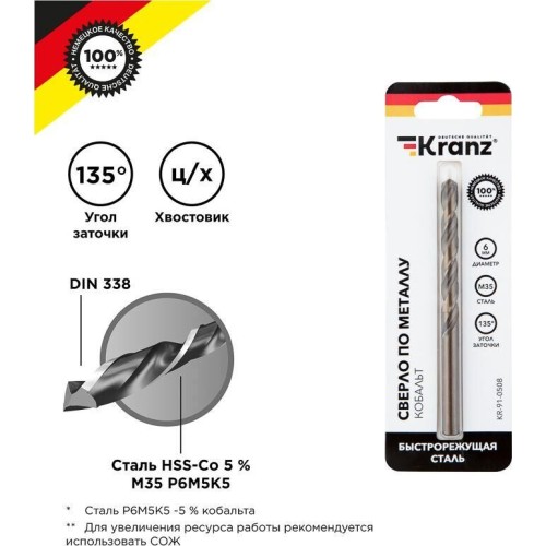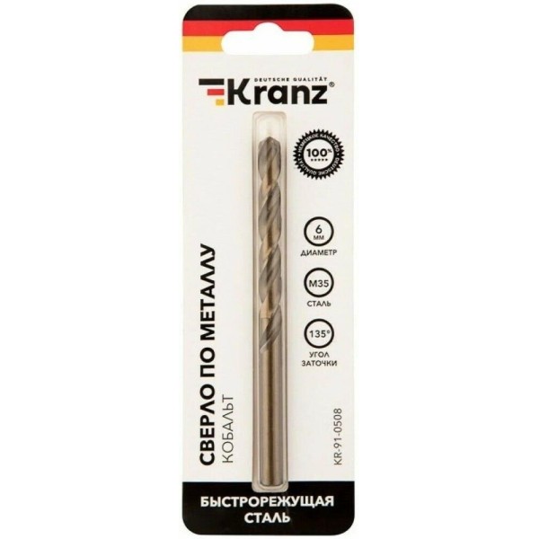 Сверло KRANZ (KR-91-0508) Сверло по металлу 6х93х57мм Кобальт (сталь HSS-Co 5% M35 P6M5K5) DIN 338, 1 шт. в блистере