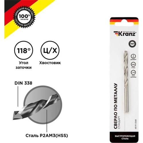 Сверло KRANZ (KR-91-0568) Сверло по металлу 7,0х109х69мм (HSS), DIN 338, 1 шт. в упаковке