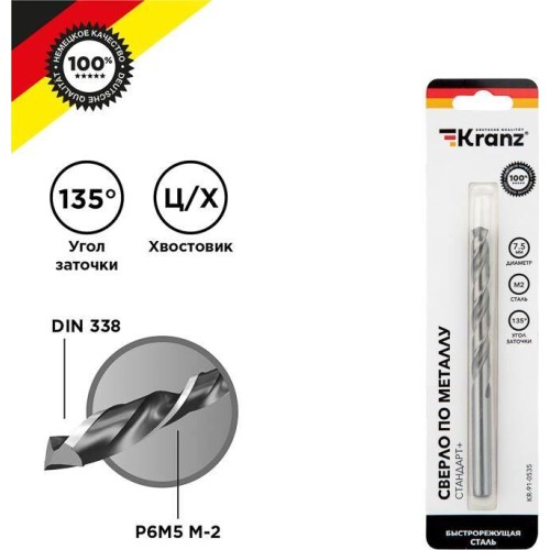 Сверло KRANZ (KR-91-0535) Сверло по металлу 7,5х109х69мм Стандарт+ (P6M5 M-2) DIN 338, 1 шт. в блистере