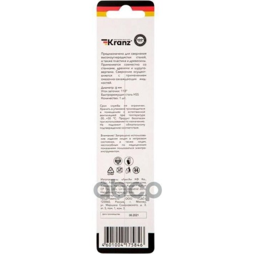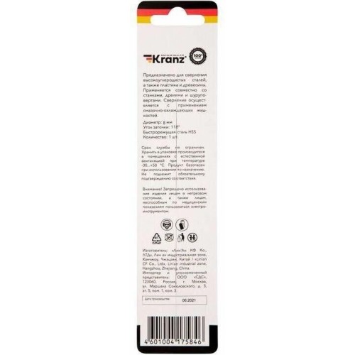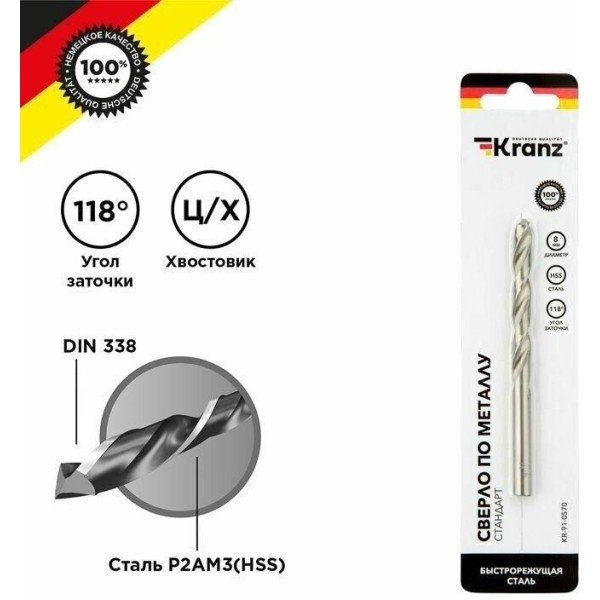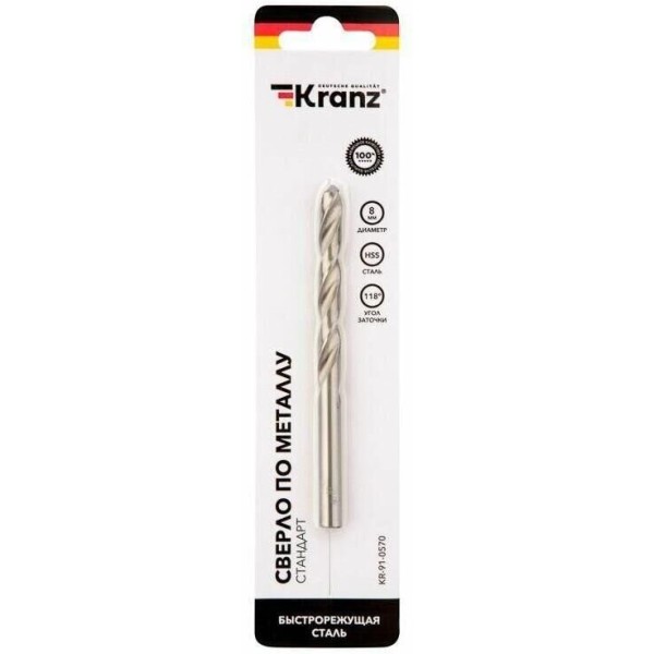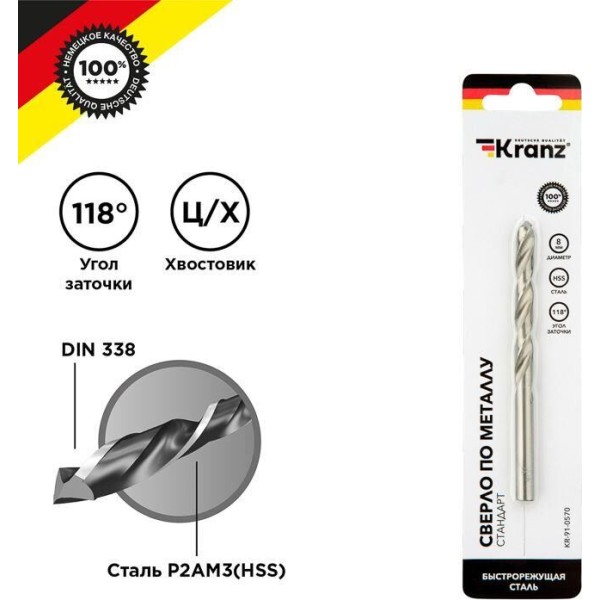 Сверло KRANZ (KR-91-0570) Сверло по металлу 8,0х117х75мм (HSS), DIN 338, 1 шт. в упаковке