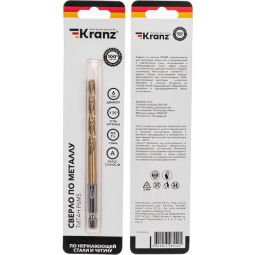 Сверло по металлу KRANZ предназначено для сверления отверстий в нержавеющей и жаростойкой стали, легированной и нелегированной стали, сером чугуне, стальном литье, цветных металлах и твердой пластмассе. Используется совместно с дрелью. Изделие выполнено из качественной быстрорежущей стали Р6М5, что обеспечивает долгий ресурс работы, высокую производительность, устойчивость к перегреву и высоким нагрузкам. Сверло обладает пониженным коэффициентом трения и обеспечивает эффективный отвод стружки. Рабочая часть инструмента позволяет быстро и надежно сверлить металл, гарантирует ровные и аккуратные отверстия. Заточка режущей части под углом 135 градусов способствует эффективному входу в материал. Покрытие из нитрид-титана предотвращает образование коррозии и преждевременный износ инструмента. Шестигранный хвостовик исключает проворачивание в зажимных патронах. Ресурс использования заметно увеличивается при использовании СОЖ.