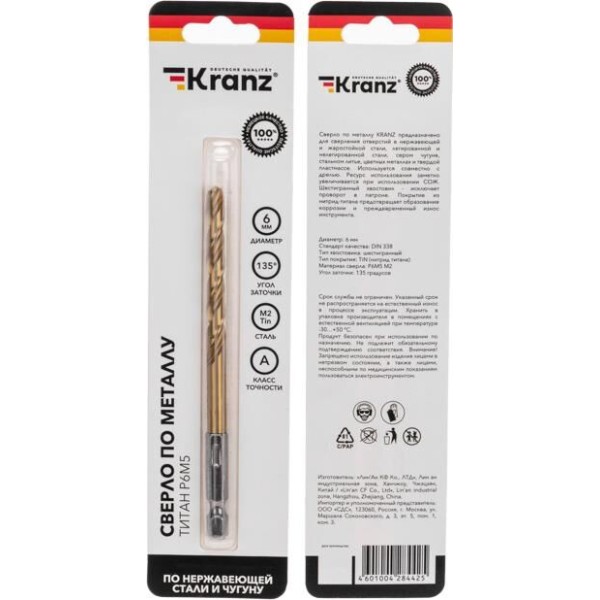 Сверло KRANZ (KR-91-5507) Сверло по металлу, 6мм, Р6М5, ТИТАН, шестигранный хвостовик (1 шт. в упаковке) DIN 338