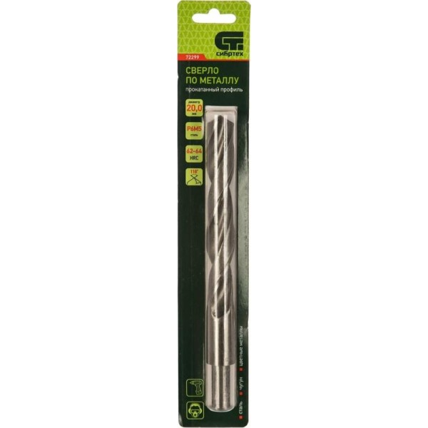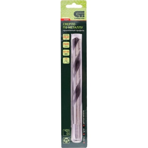 Сверло по металлу Сибртех 72299 из стали P6M5 имеет угол заточки 118 градусов и позволяет получать отверстия диаметром 20,0 мм в черных и тяжелых металлах, в том числе стали, чугуне и твердой бронзе. Сверло отличается наиболее выгодной стоимостью по сравнению с другими моделями из стали P6M5. Используется для монтажно-сборочных работ, будет полезно в быту.ПреимуществаСверло изготовлено из быстрорежущей стали, легированной вольфрамом и молибденом, поэтому устойчиво к динамическим нагрузкам и перегреву.Режущие кромки имеют твердость 62-64 HRC, поэтому долго держат заточку.Благодаря полированной поверхности уменьшается трение сверла о стенки отверстия и улучшается отведение стружки.Цилиндрический хвостовик проточен, что повышает надежность его фиксации в патроне.