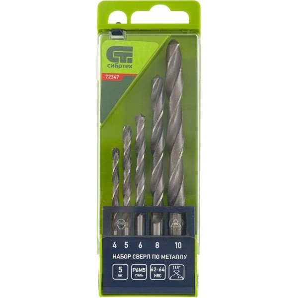 СИБРТЕХ Набор сверл по металлу, 4-10 мм, 5 шт, Р6М5, пластиковый кейс, 72347