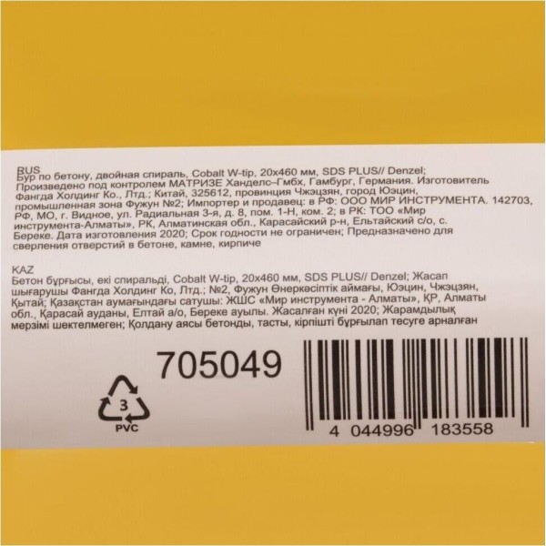 Бур по бетону Denzel арт. 705049 с хвостовиком SDS PLUS и двойной спиралью предназначен для сверления отверстий в бетоне, кирпиче и камне. Он используется в качестве оснастки для перфораторов с патроном SDS Plus. Бур оптимален для проведения строительных, ремонтных, монтажных работ.ПреимуществаВысокий ресурс — режущая твердосплавная пластина из стали ВК8 твердостью 80-90 HRC с W-образной заточкой способна сверлить отверстия до 30% быстрее, в том числе при работе с камнем.Прочность и износостойкость — рабочая часть из легированной стали 40Х выдерживает интенсивные и длительные ударные нагрузки, а также делает бур самым высокопроизводительным среди аналогов средней цены.Двойная спираль и канавка с дополнительным желобом — за счет более эффективного отвода шлама рабочая часть не перегревается, что позволяет продлить срок службы бура.Удобная упаковка с европодвесом — оснастку можно разместить на стенде.