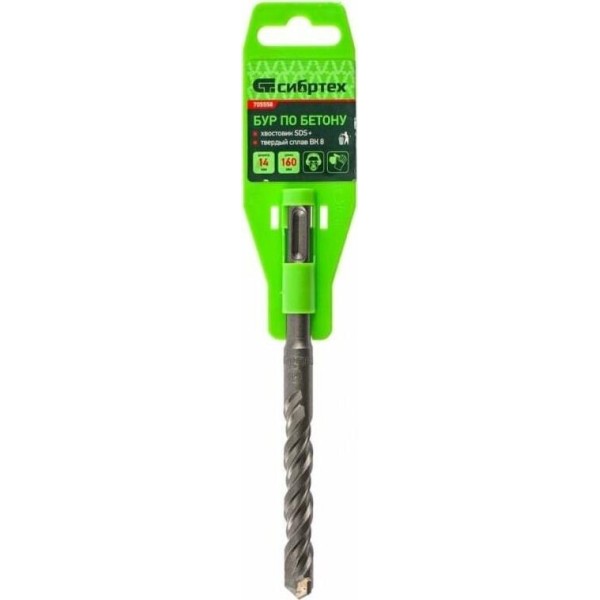 Бур по бетону Сибртех 705558 размером 14 х 160 мм предназначен для перфораторов с хвостовиком типа SDS Plus. Способен сверлить отверстия в материалах из бетона и кирпича, а также в искусственном и природном камне. Бур отлично подойдет для домашнего использования со средним объемом работ.ПреимуществаПрочность и износостойкость — режущая пластина пониженной пористости изготовлена из высококачественной стали ВК8 и закалена до твердости 87-90 HRC.Долговечность — корпус выполнен из легированной стали 40Х и термообработан — это обеспечивает одинаковую твердость всей спиральной части бура, благодаря чему он способен выдерживать динамические нагрузки.Защитное покрытие — бур не подвержен образованию коррозии, а значит, он дольше прослужит мастеру.Выгода приобретения — буры Сибртех отличаются не только оптимальным соотношением цены и качества, но и высоким ресурсом по сравнению с аналогами.