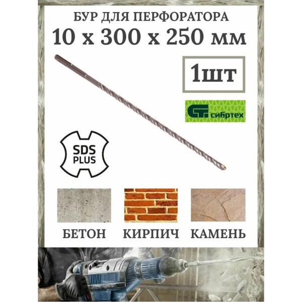 Бур по бетону Сибртех 70565 размером 10 х 300 мм предназначен для перфораторов с хвостовиком типа SDS Plus. Способен сверлить отверстия в материалах из бетона и кирпича, а также в искусственном и природном камне. Бур отлично подойдет для домашнего использования со средним объемом работ.ПреимуществаПрочность и износостойкость — режущая пластина пониженной пористости изготовлена из высококачественной стали ВК8 и закалена до твердости 87-90 HRC.Долговечность — корпус выполнен из легированной стали 40Х и термообработан — это обеспечивает одинаковую твердость всей спиральной части бура, благодаря чему он способен выдерживать динамические нагрузки.Защитное покрытие — бур не подвержен образованию коррозии, а значит, он дольше прослужит мастеру.Выгода приобретения — буры Сибртех отличаются не только оптимальным соотношением цены и качества, но и высоким ресурсом по сравнению с аналогами.