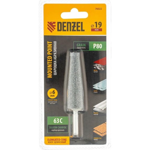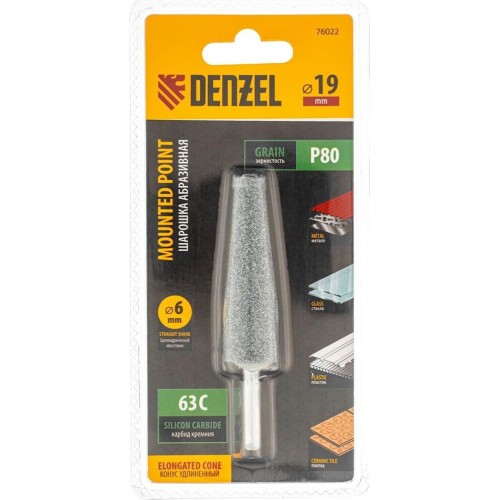 DENZEL Шарошка абразивная, конус удлиненный, для дрели (ПШМ), 19 x 60 мм, хвостовик d6 мм, 63С 76022