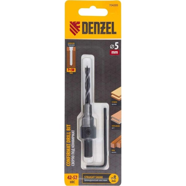 Сверло-зенкер Denzel 704205 диаметром 5 мм предназначено для получения точных и ровных отверстий под мебельную стяжку (евровинты, конфирмат) без дополнительного зенкования. Устанавливается в патрон дрели или сверлильного станка, подходит для работы с изделиями из древесины, ДСП, ЛДСП, фанеры. Оснастка пригодится во время сборки мебели и проведения ремонтных работ.ПреимуществаПрочность — сверло изготовлено из высококачественной инструментальной стали.Высокий ресурс — оснастка твердостью 48 HRC долго сохраняет рабочие свойства.Защита от разрушения — оксидированное покрытие предотвращает образование коррозии.Получение разных отверстий без замены оснастки — глубина сверления регулируется в диапазоне 50-70 мм.Быстрый поиск нужного сверла — на корпус нанесена четкая маркировка с обозначением диаметра.Полная комплектация — оснастка поставляется с имбусовым ключом для фиксации сверла.Универсальность — цилиндрический хвостовик совместим со стандартными патронами дрелей.
