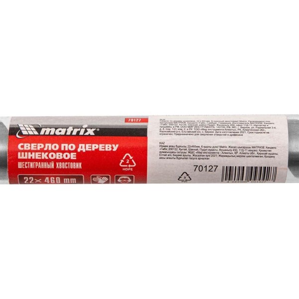 MATRIX Сверло по дереву шнековое, 22 х 460 мм, шестигранный хвостовик 70127
