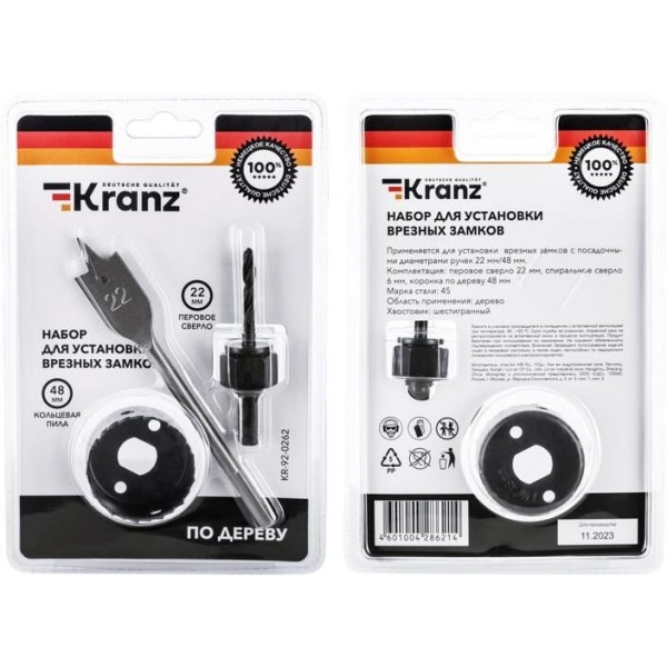 KRANZ Набор для установки врезных замков, 22 мм/48 мм (перовое сверло/кольцевая пила)